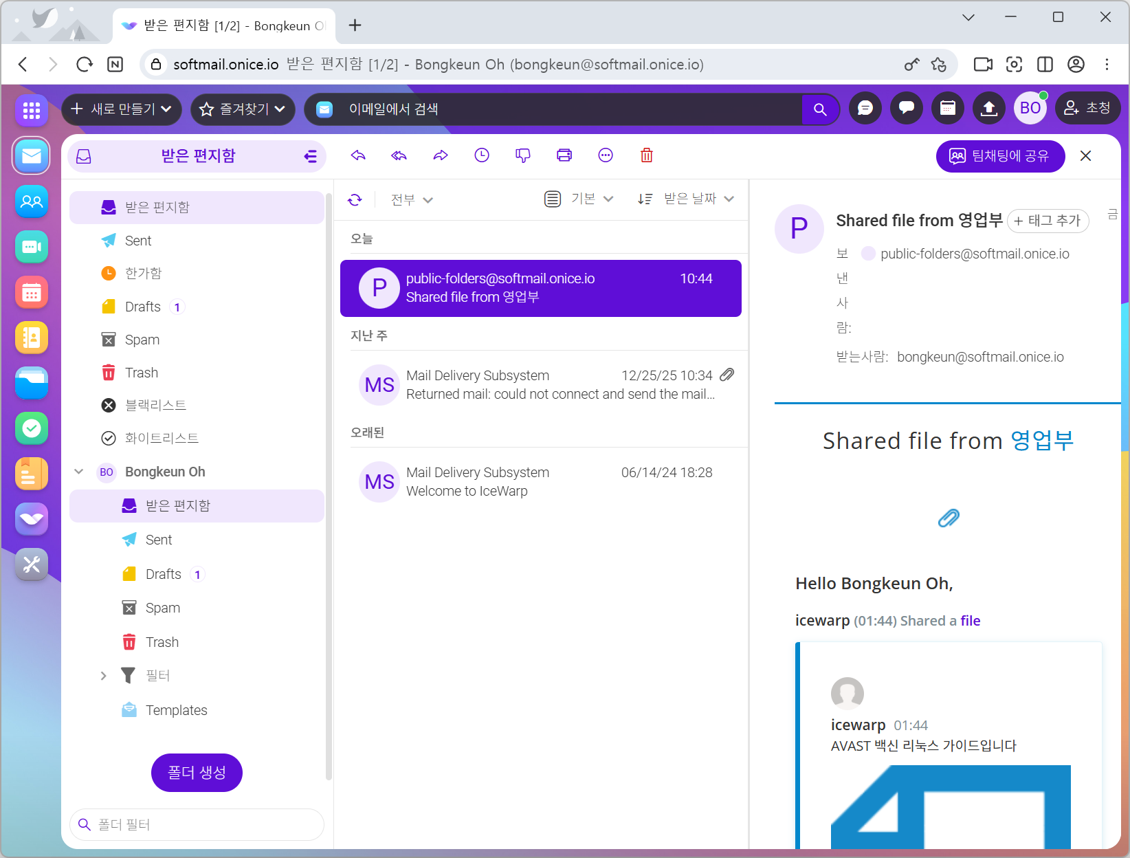 어디서나 브라우저로 접속. 받은편지함, 일정관리, 연락처, 팀채팅을 통합 관리.
